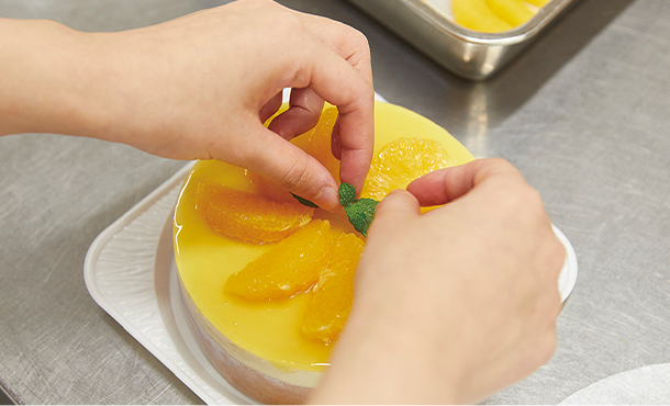オレンジジュースに砂糖とペクチンを加えて⽕にかけ、ジュレを作製。ムースの表⾯に流しかけ、パレットナイフで均⼀に整えて仕上げます。パレットナイフのかたむき加減に気をつけて!