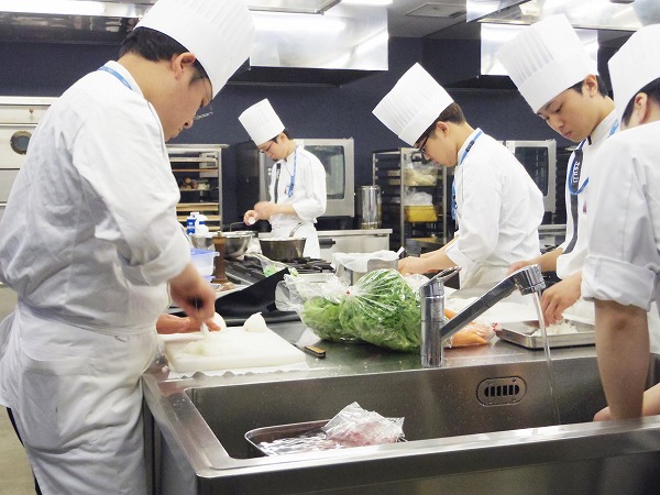 食中毒や異物混入のリスクを最小限に抑えるため、学生たちは真剣な表情で取り組みます。