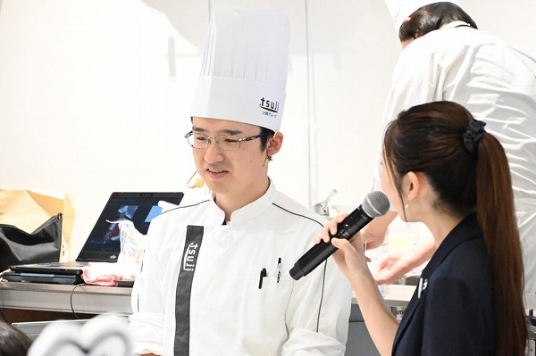 ステージでデモストレーションをする学生、後ろで試食の準備をする学生、