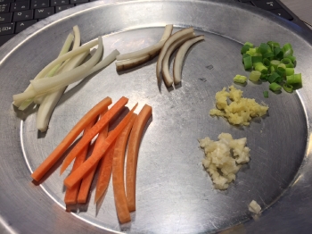 野菜と牛肉を炒めます。