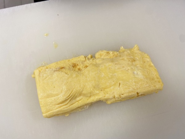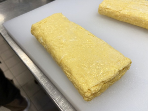 だし巻き玉子です。だし汁を加えると卵生地が柔らかくなる分、巻きにくくなります。