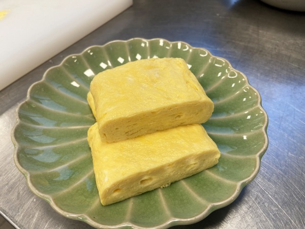 そのため卒業までに全員写真のような100点満点のだし巻き玉子が巻けるように練習を重ねてもらうのです。
