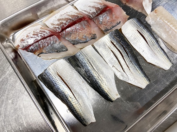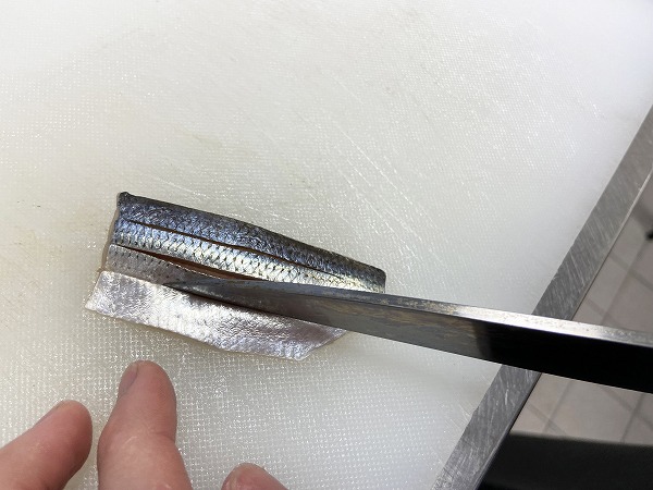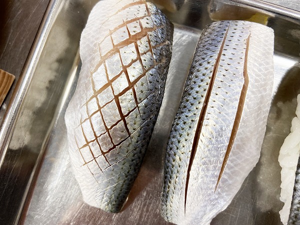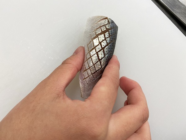 特に皮がピカッと光るコハダは切り込みを入れると美しく見えます。