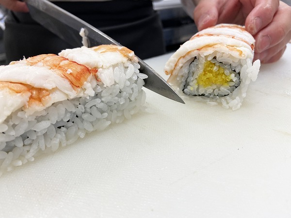 海老の裏巻きが完成、応用で今日は鯛を使っての裏巻きもやりますよ。