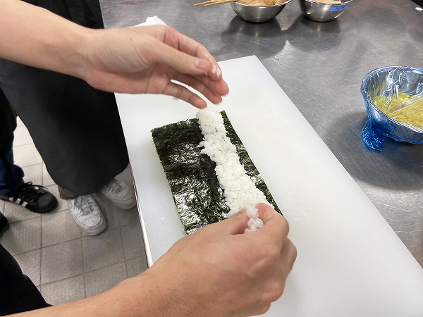 昨日、下準備した魚、おぼろを使い今日は「裏巻き(巻きずしの応用)、握りずし」を実習します。