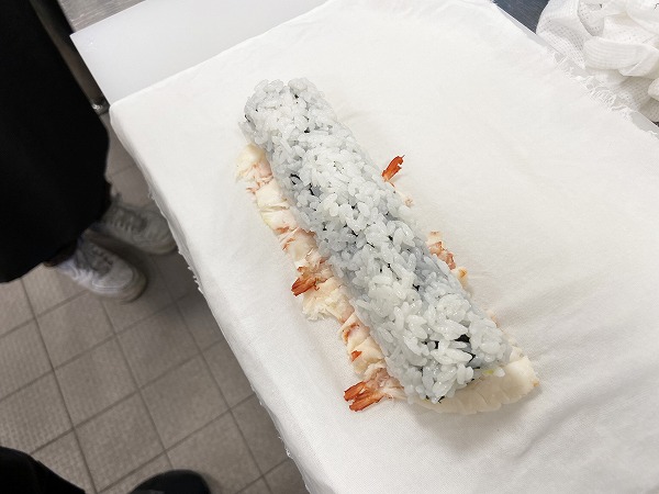 「次は開いた海老を下に敷き筒状のすし飯を真ん中に置く!その後、布巾で巻きます。」