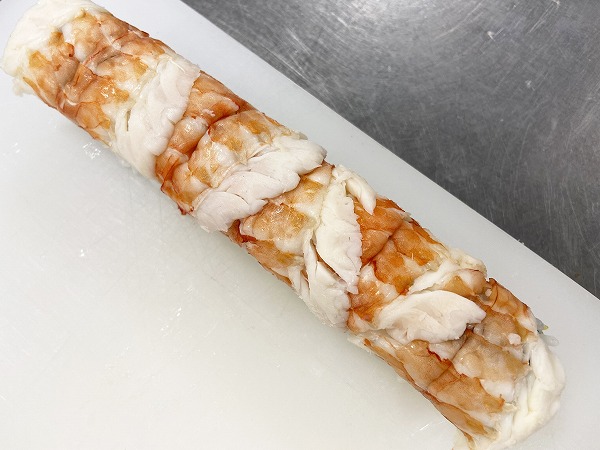 ほら御覧の通り「海老の裏巻き」となります包丁で切ると真ん中に黄色おぼろが顔をだします。