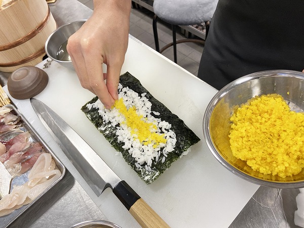 すし飯の中央に昨日仕込んだ「おぼろ」をパラパラとおいていきます。