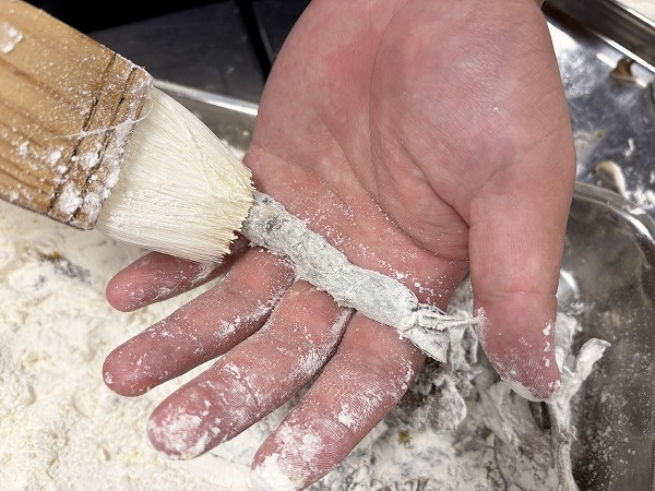 과하게 묻은 밀가루는 붓으로 털어내어 식재료 표면에 얇고 고르게 밀가루가 입혀지도록 합니다.