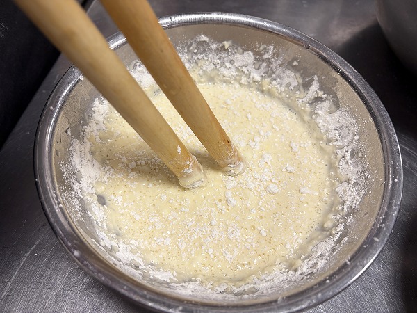 달걀물과 체 친 밀가루를 점성이 생기지 않도록 조심스럽게 섞습니다.