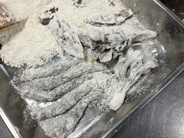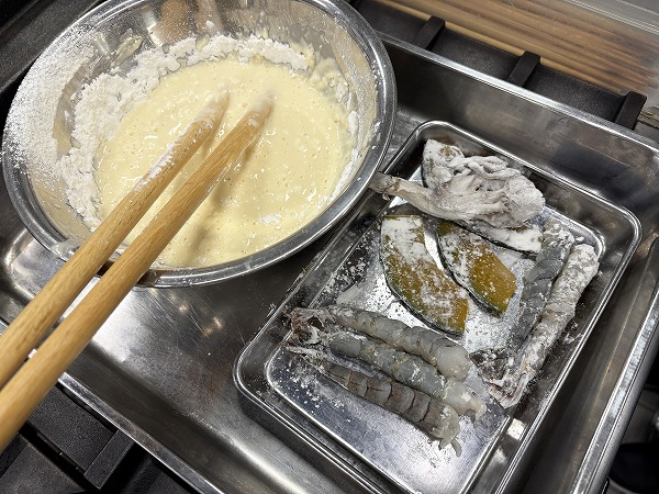 전문 용어로는 '시타코나(下粉)를 묻힌다'라고 하는데 이는 식재료에 튀김옷을 입혔을 때 반죽이 잘 붙고 떨어지지 않도록 하기 위한 과정입니다.