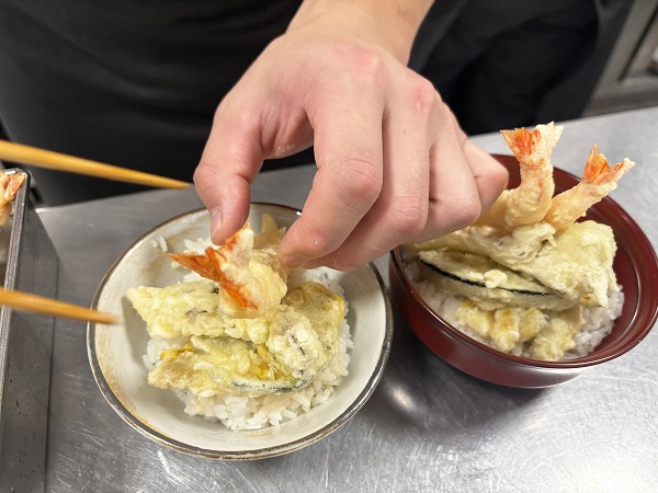 튀김을 맛있게 튀기는 요령을 배우며 두 가지 종류의 덴동(天丼, 밥 위에 덴푸라 몇 가지를 올리고 소스를 더한 일본식 튀김 덮밥)을 완성합니다.