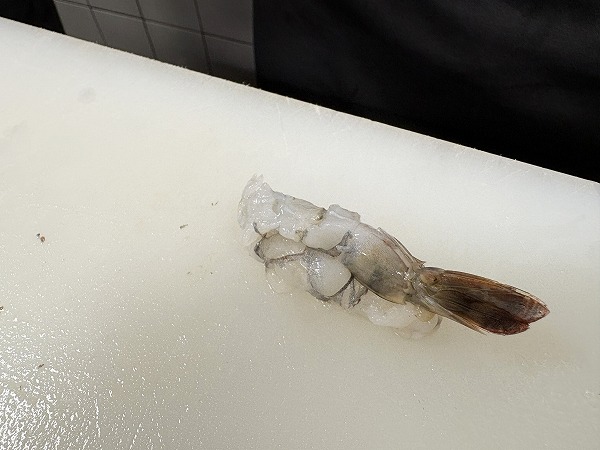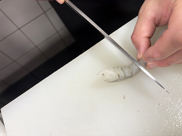 전문용어로는 '스지키리(筋切り)'라고 하며 새우의 배 쪽에서 약 다섯 군데 정도에 칼집을 넣어 힘줄을 끊습니다.