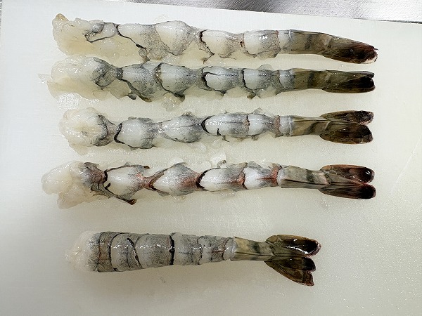 가장 앞쪽의 힘줄 절개를 하지 않은 새우와 비교하면 약 1.5배 정도 길게 펴졌습니다!