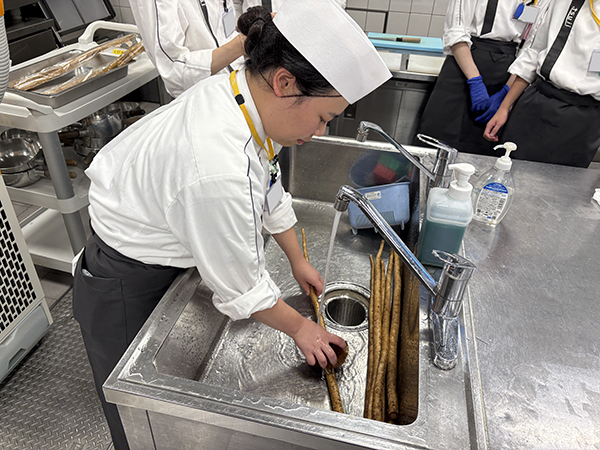 ではさっそく実習開始!まずは牛蒡の準備、表面をたわしで洗い土や汚れを落とします!ゴシゴシ