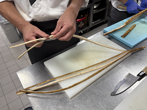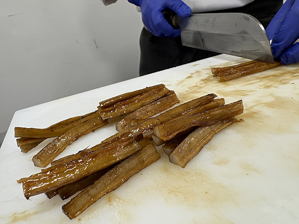 牛蒡はとても固いので割いている最中にボキッと折れやすいのです。「今日は途中で折れないように8つ割りにしてください」と先生からの指示があり!