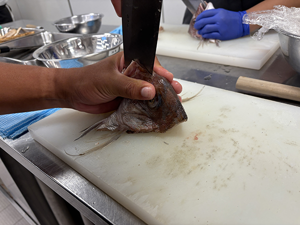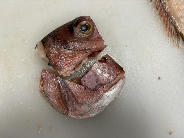 次は鯛の頭を2つに割りますが、力が必要な仕事です!頭の骨は大きく固いのです。