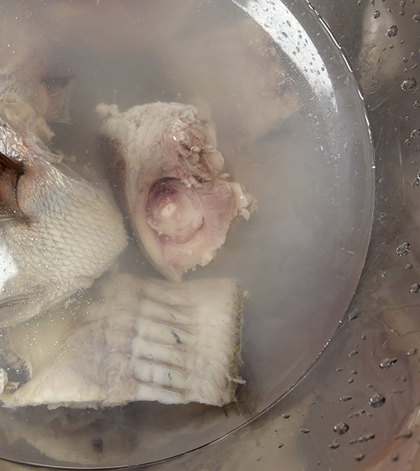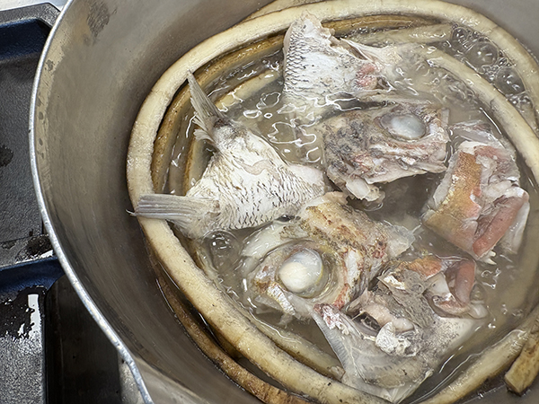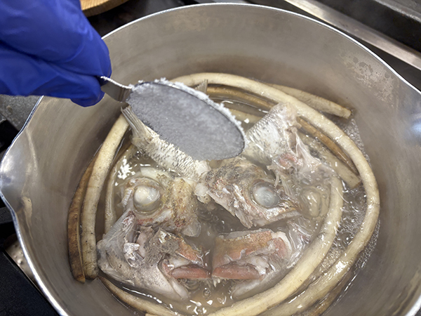 次は鯛のあらに80度くらいの湯をかけて、表面だけ軽く火を通します!専門用語で「霜降り」と言います。