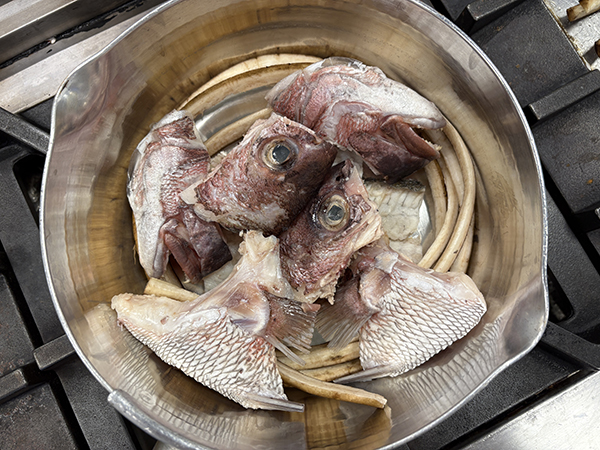 下準備が終わった鯛あらを煮ていきます!鍋に割いた牛蒡を敷き、鯛あらを並べていきます。