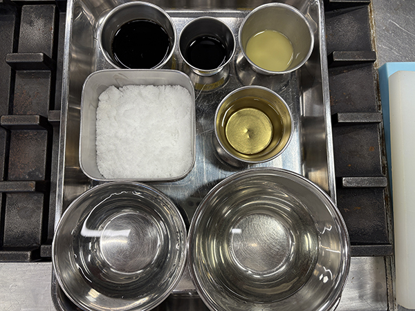 手前左から水、酒、2列目は砂糖、みりん、3列目は左から濃口醤油、たまり、生姜の絞り汁です!