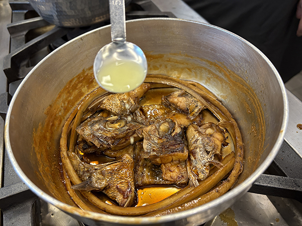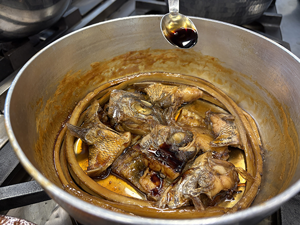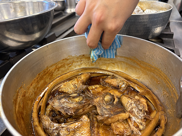 「鍋の中は鯛あらでびっしり占めているから、煮汁をかけにくいよね」そうやね。