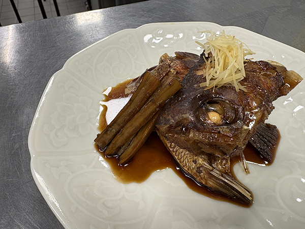 鯛のあら煮、1人前完成! 天盛りに針生姜! 味を引き締めます。