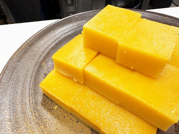 卵、白身魚のすり身をベースに砂糖、酒を混ぜ合わせてオーブンで焼いたものです。