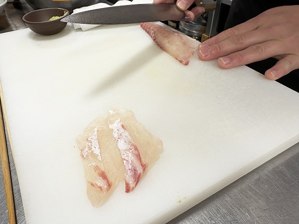 鯛はオーダーが通れば身を切り出すところから始めます。客前での演出です。