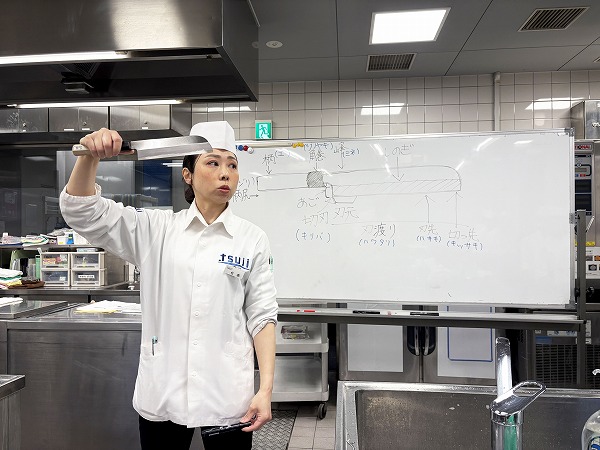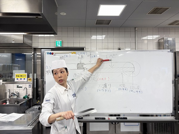 授業がスタート、本日担当の松島先生からまずは薄刃包丁の部位の名称と特徴について説明があります!