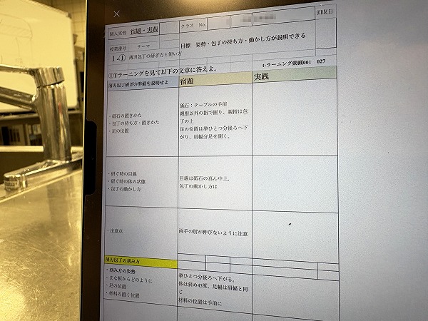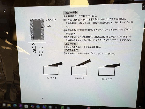 学生は授業の予習として、事前に日本料理学科オリジナル動画で包丁を研ぐときの姿勢や包丁の動かし方、