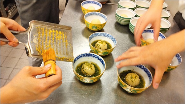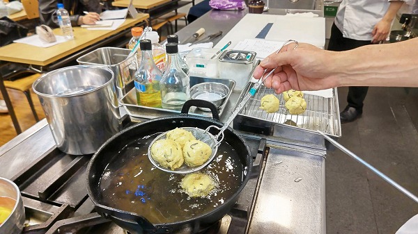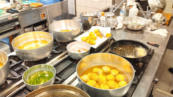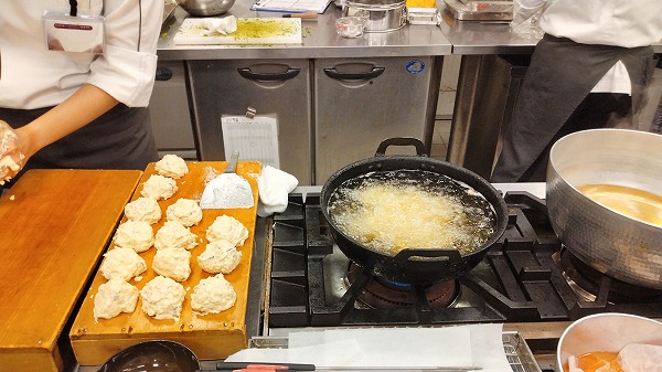これは椀物の飛竜頭(ひりょうず:"がんもどき"のこと)を油で揚げているところです。