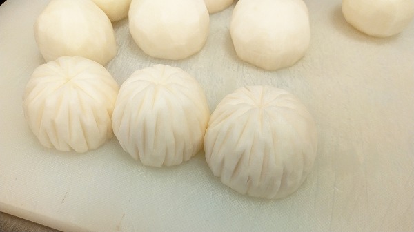 蕪を器の大きさに合わせ皮をむき、切り込みを入れ菊の花の模様に剥きます。