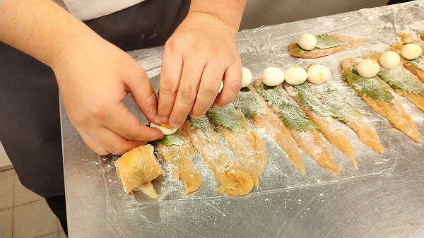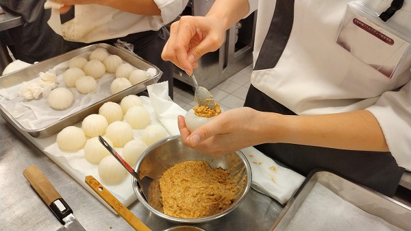 湯がいた蕪にミンチを詰めています。この後蒸してミンチに火を通し煮汁で味を煮含ませます。