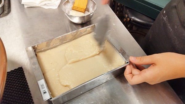 流し缶に煮穴子を敷き詰め、上から真丈生地を流し、表面を整え蒸し固めます。