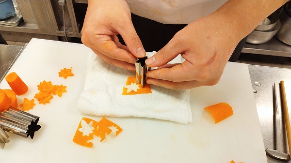 桂むきにした人参を紅葉の型で抜いています。