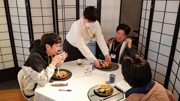 料理をつくる人、提供する人、食べる人で3つの役割分担を決め、店舗での料理提供をトレーニングするこの実習。