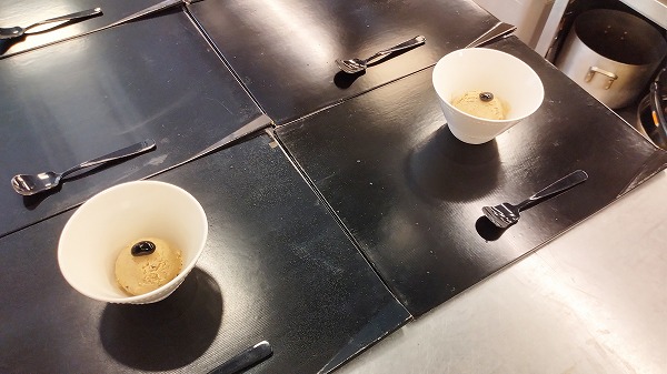 最後は黒豆アイス、裏ごしした黒豆と粒の黒豆が中にたっぷり入り、天に黒豆を飾っています。