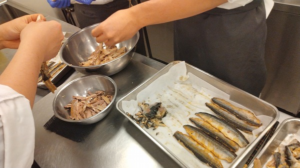 おっと、焼いた秋刀魚をほぐし始めました。