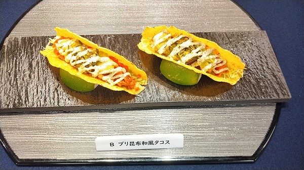 トップバッターBチームの「ブリ昆布和風タコス」の完成です!