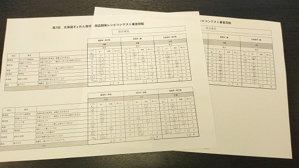 審査員用採点用紙は、創造性・普及性・味覚・実用性・食材の活用・総合(盛り付け)の項目に分かれていて、それを基準に採点を行います。