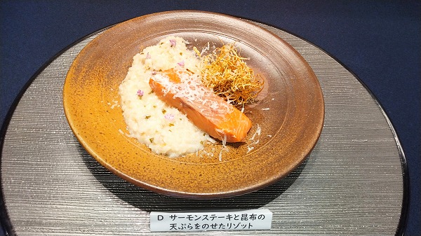 メニューは「サーモンステーキと昆布の天ぷらをのせたリゾット」、