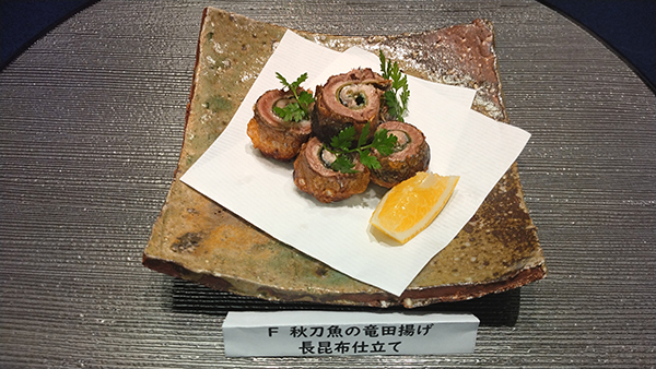 青紫蘇と長昆布を秋刀魚で巻いた「秋刀魚の竜田揚げ~長昆布仕立て」。