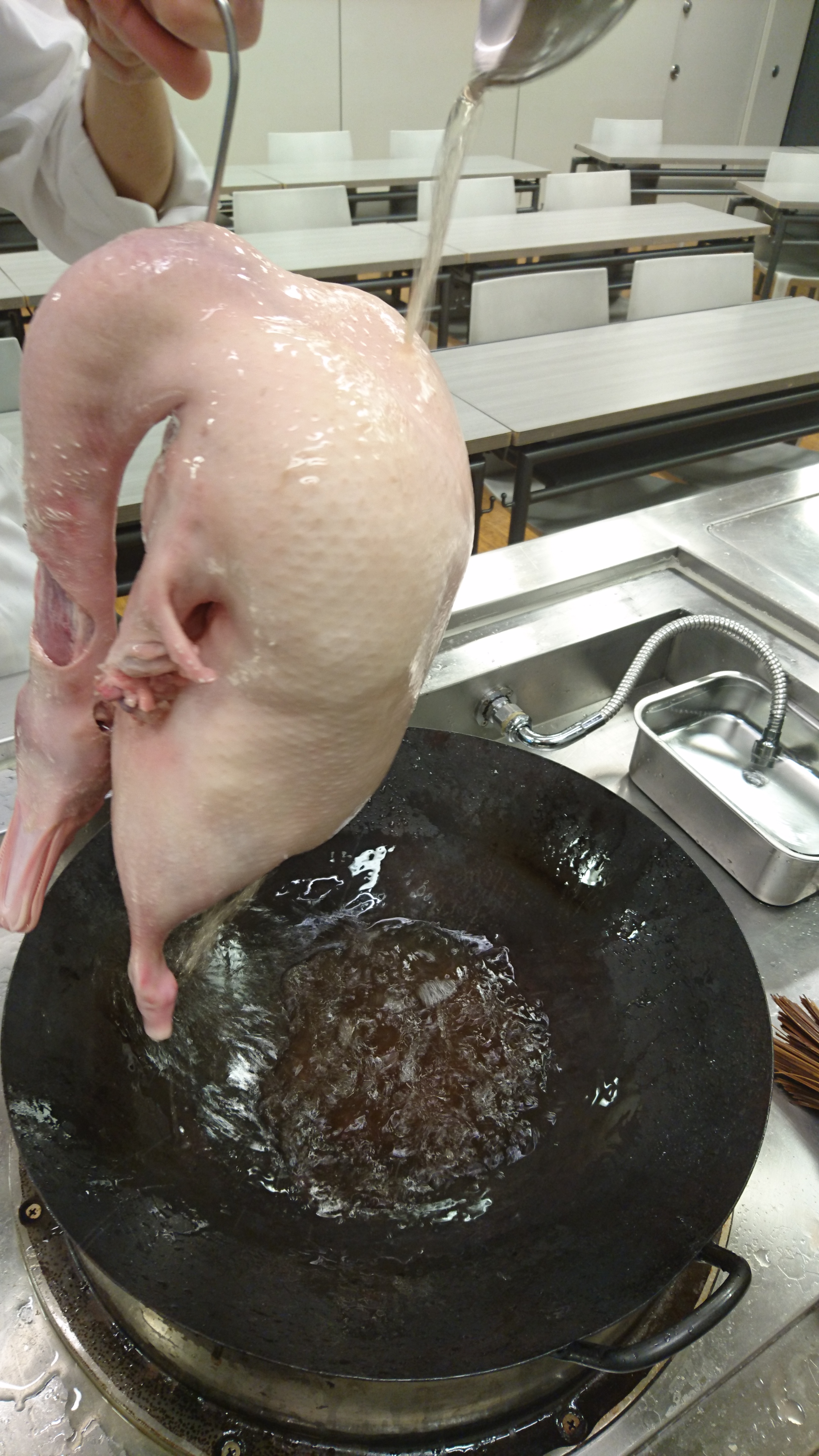 表面に薄い水飴をかけて乾燥させるのですが、水飴がかかりやすいように熱湯をかけて皮をピンッとはらします!