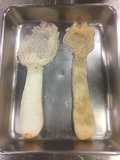 左の白いのが天然もので、右の茶色のほうが養殖ものです。