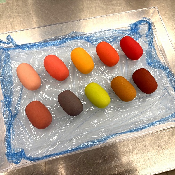 時間内に練切を赤・黄・青の3色の色素から指定された10色に着色します。