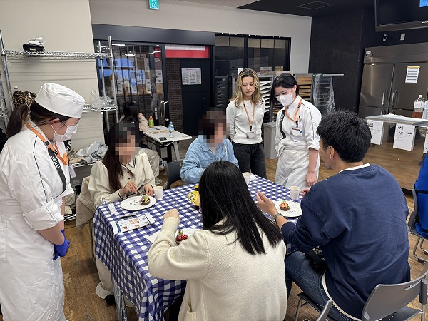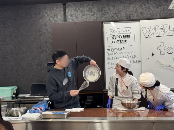 学生と保護者が対戦し、どちらが上手にメレンゲを泡立てられるかを競うという、とても盛り上がる企画でした。