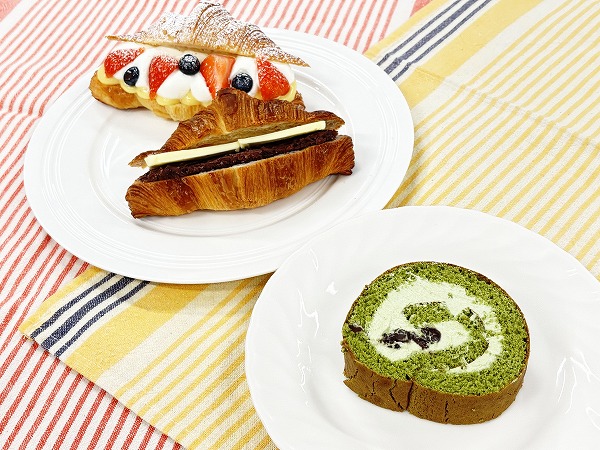 →抹茶風味のシート生地に抹茶味のクリームを合わせました!中に入れる粒餡は自家製の粒餡です。