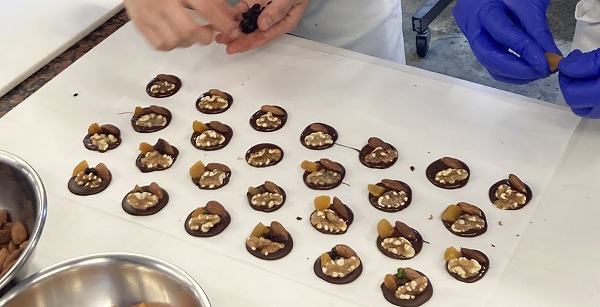 チョコレートを丸く絞り、ドライフルーツやナッツ類を乗せたもの、