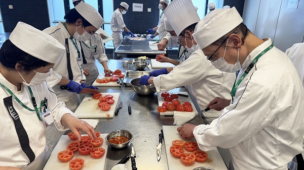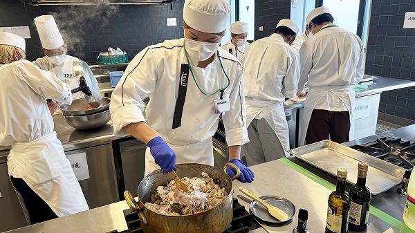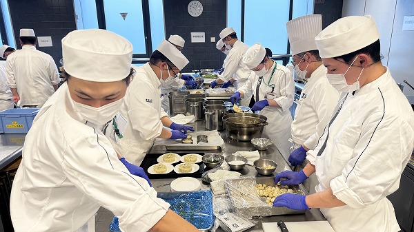 忙しい中ですが普段を違う実習室の雰囲気に仕込みをしている学生も楽しそうに作業していました。