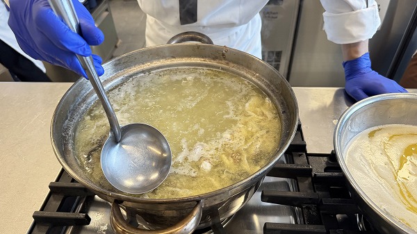 次に先程捌いた鯛のアラを使って、フュメ・ド・ポワソンという魚のだし汁を取っていきます。